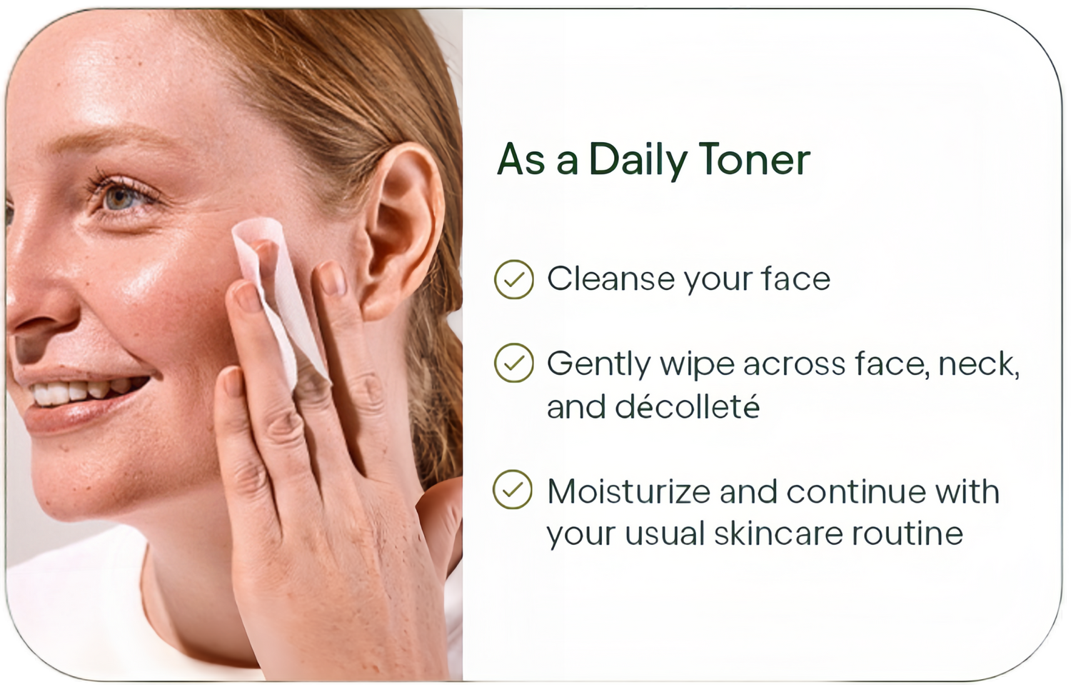 - How to Use: After cleansing,sweep a pad across the face, avoiding the eye area.Use morningor night. Follow with serum or moisturizer.