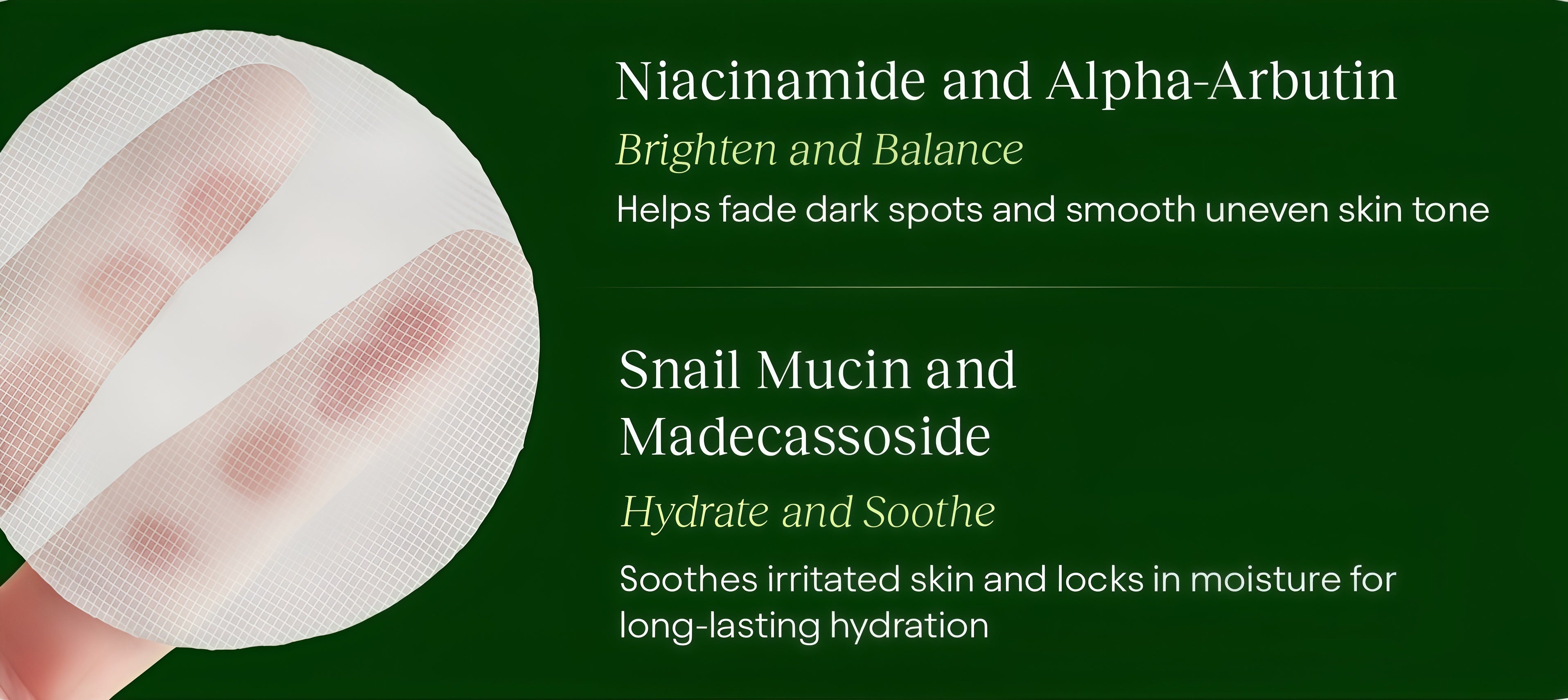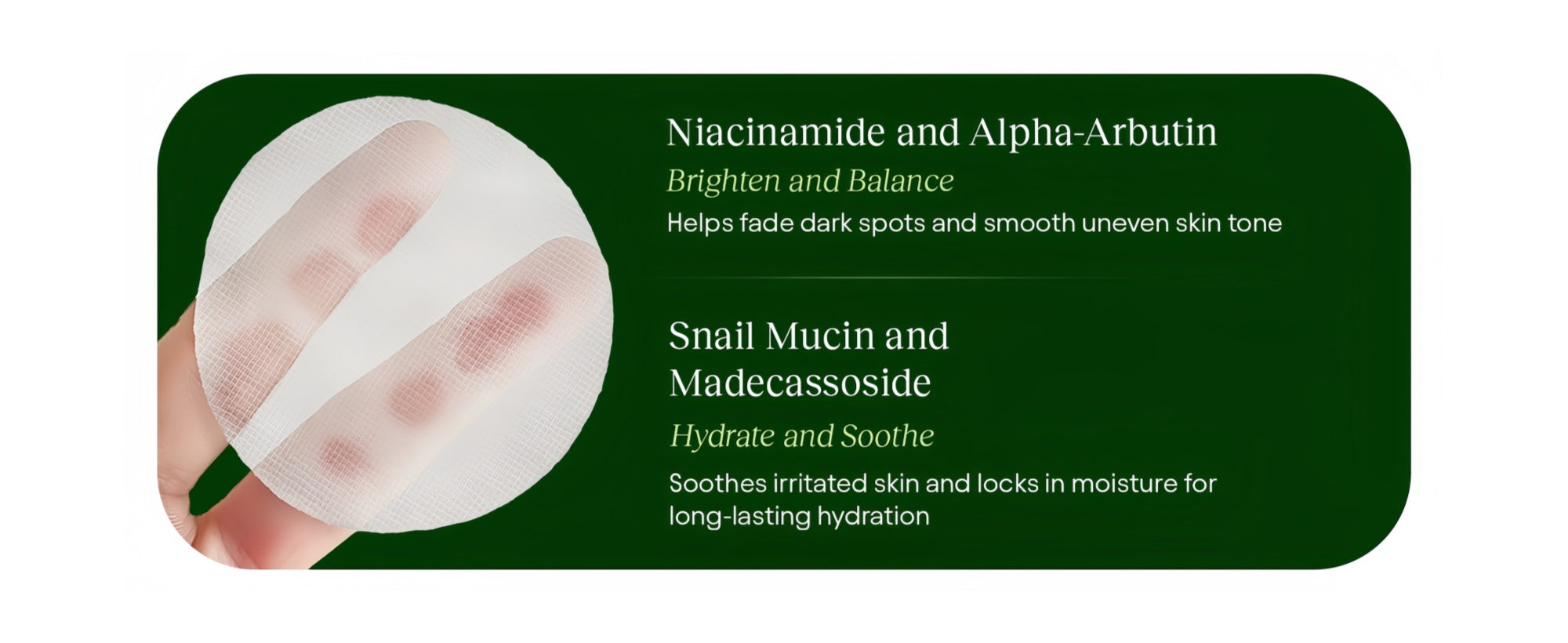 These convenient toning pads are saturated with a powerhouse blend of snail mucin, niacinamide, peptides, and centella asiatica to refine texture, fade the look of dark spots, and replenish moisture. The textured side buffs away dead skin cells for a soft, even surface, while the smooth side delivers calming, hydratingingredients. Incorporateinto your morning or evening routine for visibly revitalized, radiant skin.